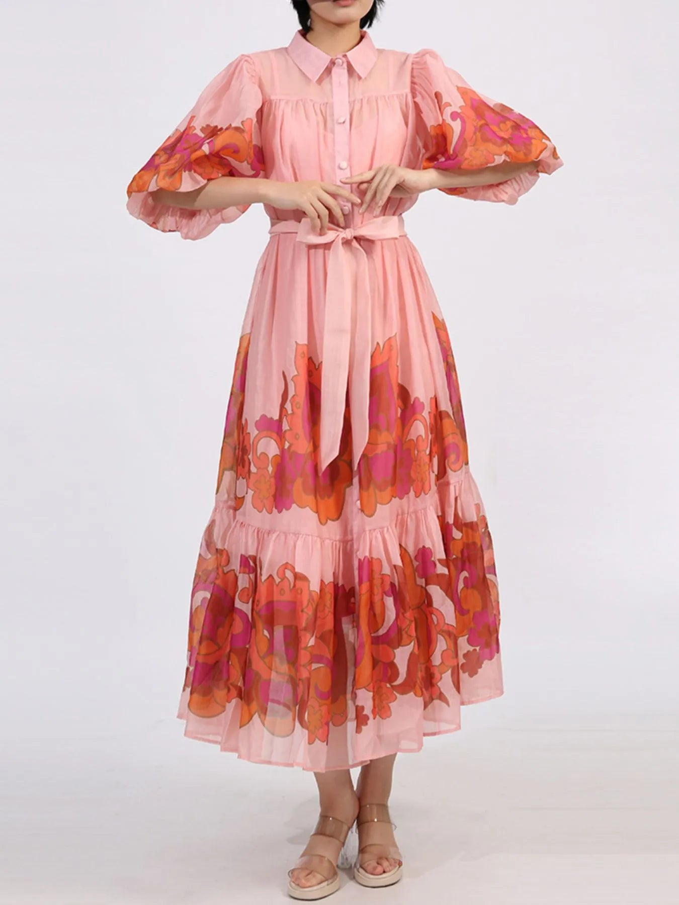Button Front Puff Sleeve Dress