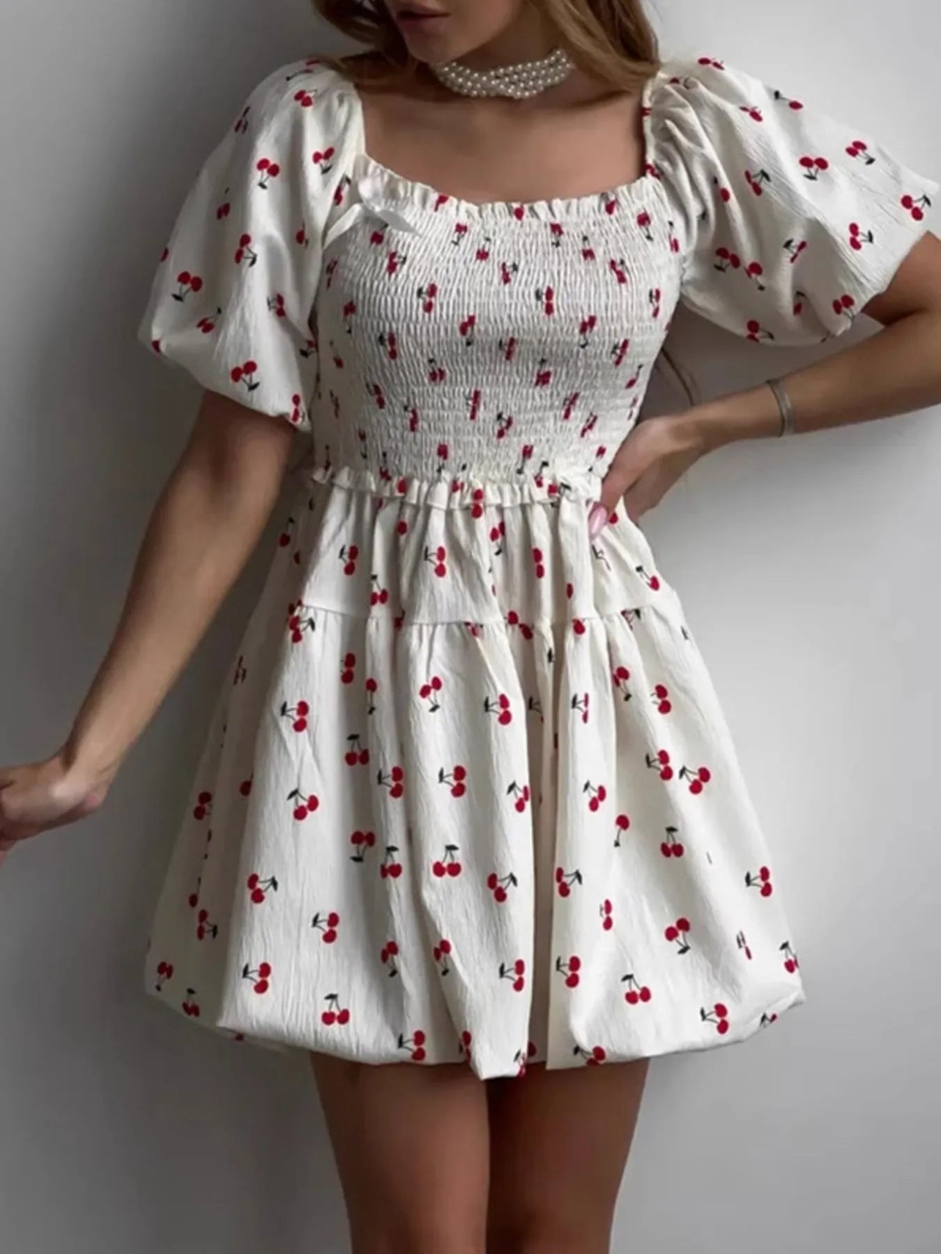 Puff Sleeve Cherry Print Smocked Mini Dress