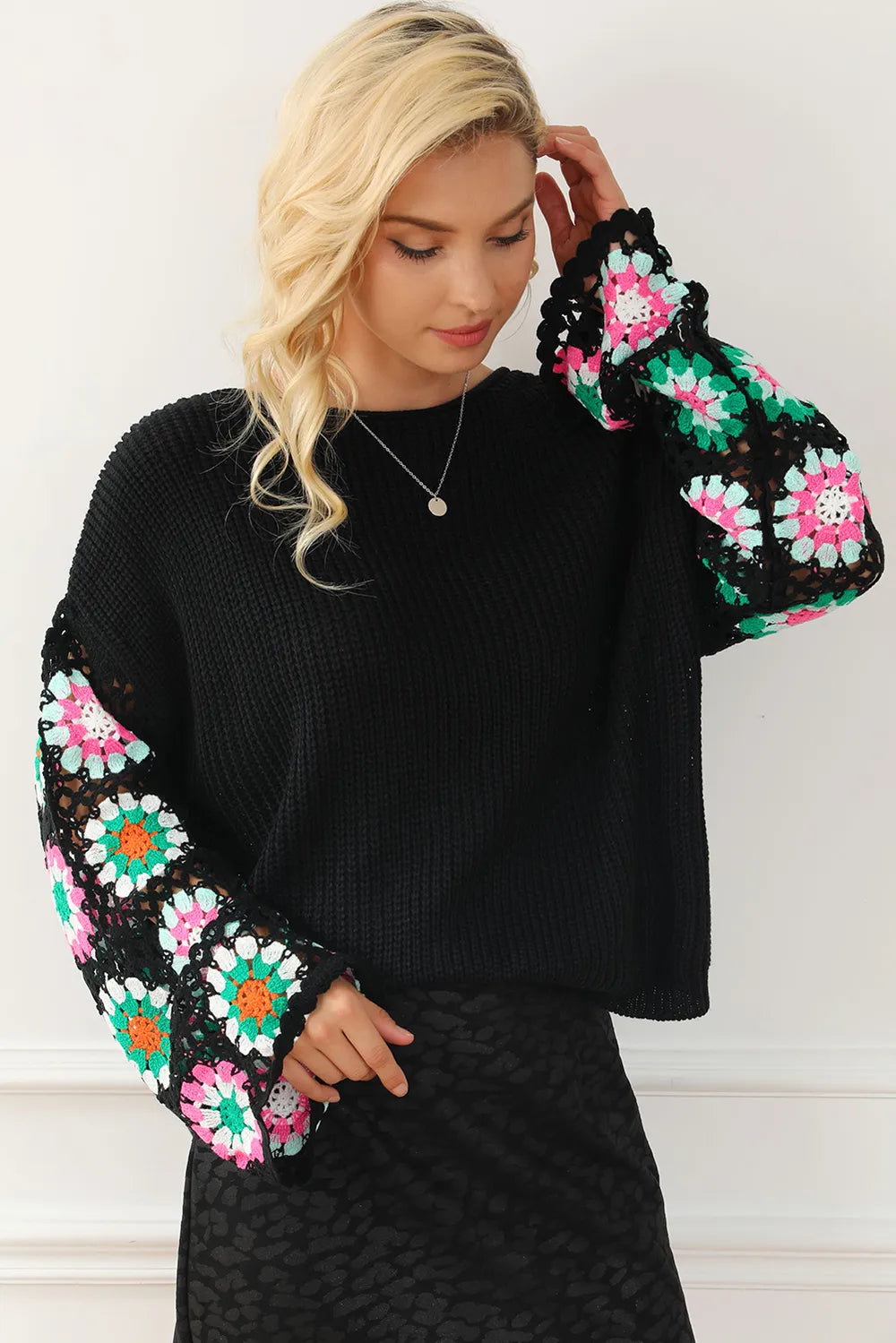 Velste Crochet Round Neck Long Sleeve Knit Top