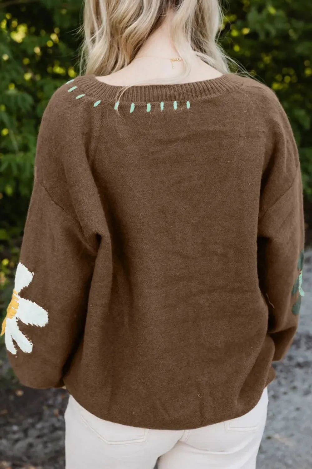 Velste Flower V-Neck Dropped Shoulder Sweater